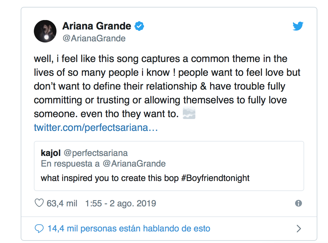Ariana Grande ha presentado este viernes 2 de agosto un nuevo single inédito hasta la fecha, ya que no se encuentra dentro de su último disco, Thank U, Next. Se trata de Boyfriend, una colaboración junto al dúo Social House. En poco más de 10 horas ya supera los 6 millones de reproducciones en YouTube.